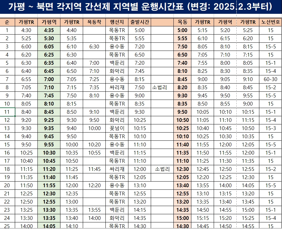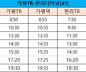 환승 + 정확한 시간표 조합이 가평에서는 훨씬 빠르고 효율적이다.