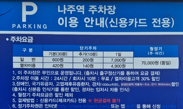 나주역 주차장은  유료 주차 입니다. 무료는 10분주차가 가능하며, 유료 구역은 10분당 요금이 부과됩니다. 장기 주차가 필요할 경우 유료 구역을 이용해야 합니다.