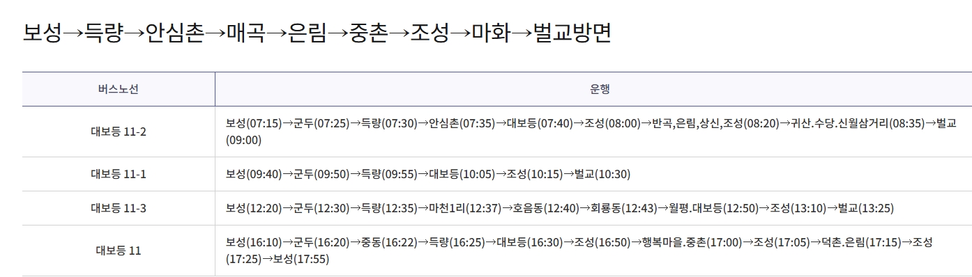 보성 ↔ 조성 노선: 보성터미널에서 출발하여 조성을 연결하는 노선입니다. 첫차는 오전 6시 50분, 막차는 오후 7시 20분에 운행되며, 약 40분 간격으로 운행됩니다. 보성 ↔ 득량 노선: 보성터미널에서 출발하여 득량을 경유하는 노선입니다. 첫차는 오전 7시 10분, 막차는 오후 6시 40분에 운행되며, 주요 경유지는 득량역과 인근 마을입니다. 보성 ↔ 문덕 노선: 보성터미널에서 출발하여 문덕을 연결하는 노선입니다. 첫차는 오전 6시 40분, 막차는 오후 7시 10분에 운행되며, 약 50분 간격으로 운행됩니다.