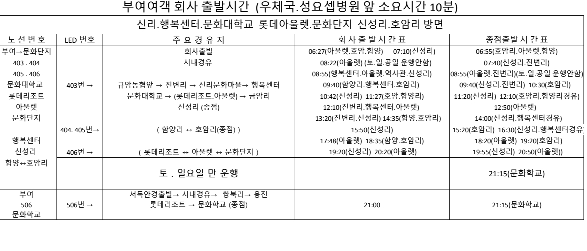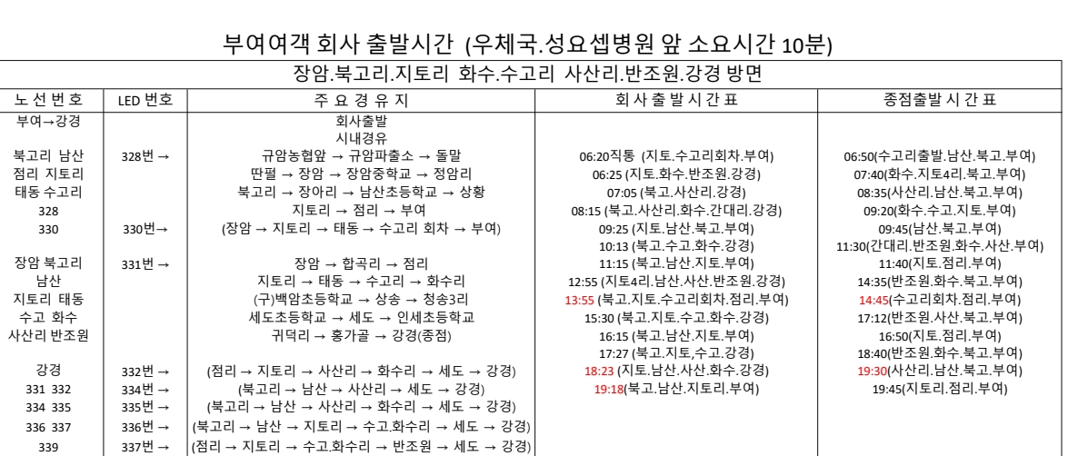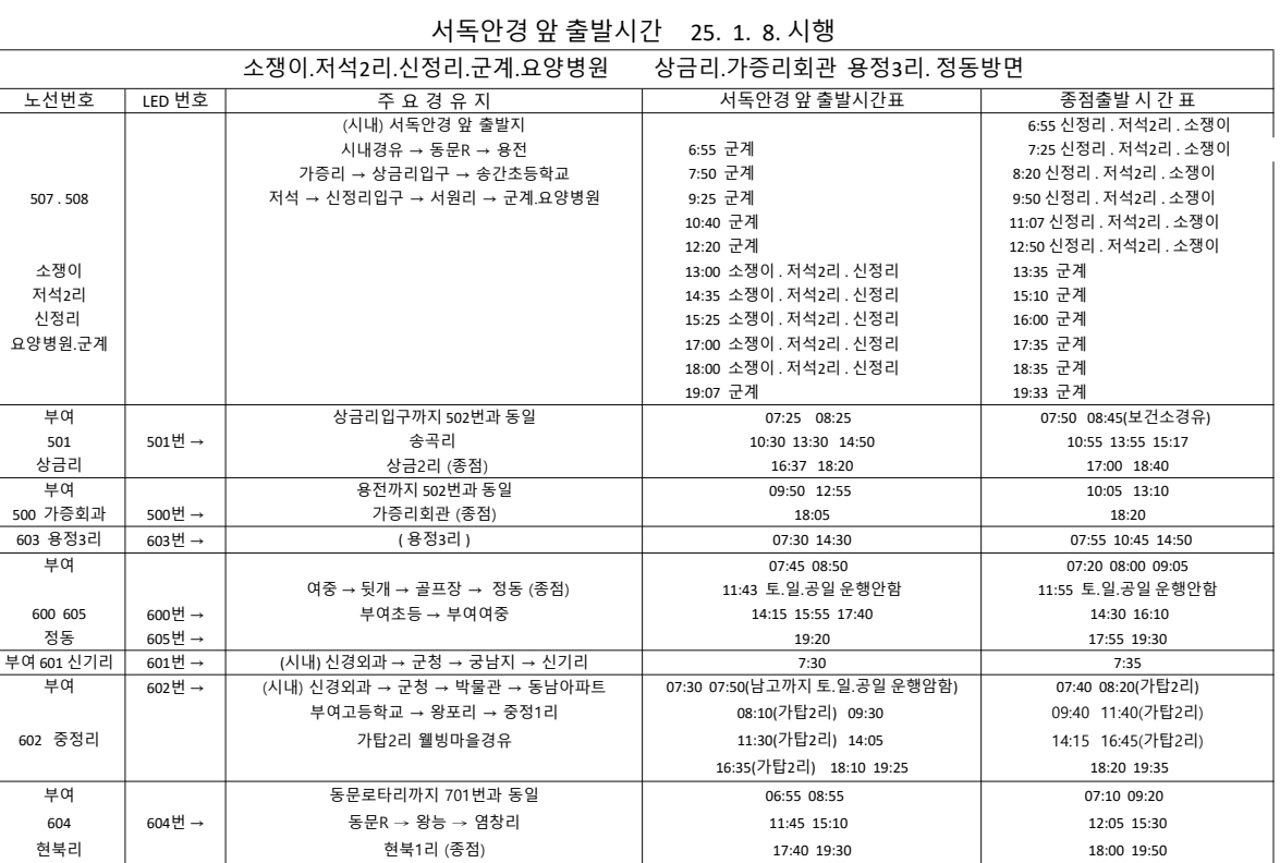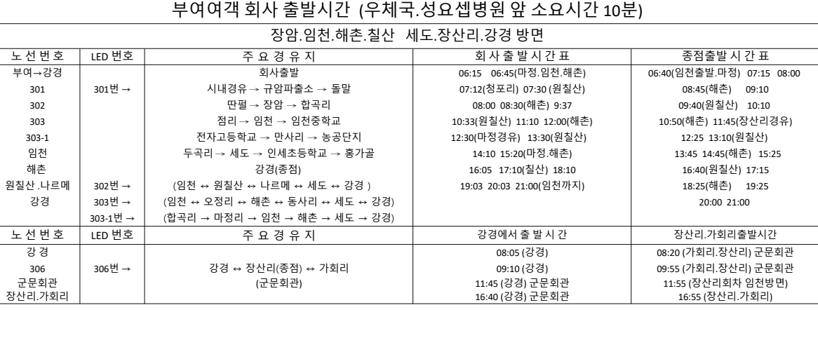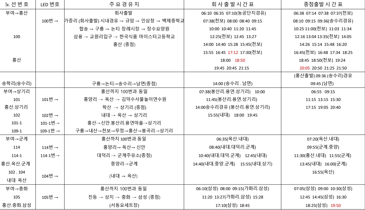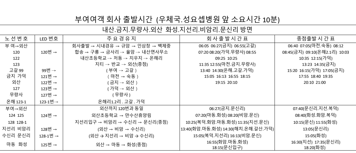 🚌 부여군 시내·농어촌버스는 부여여객 한 곳에서 운영하며, 각 지역을 촘촘히 연결하고 있습니다. 주요 노선별 첫차-막차 시간, 배차 간격, 운행 구간을 한눈에 파악해보세요!