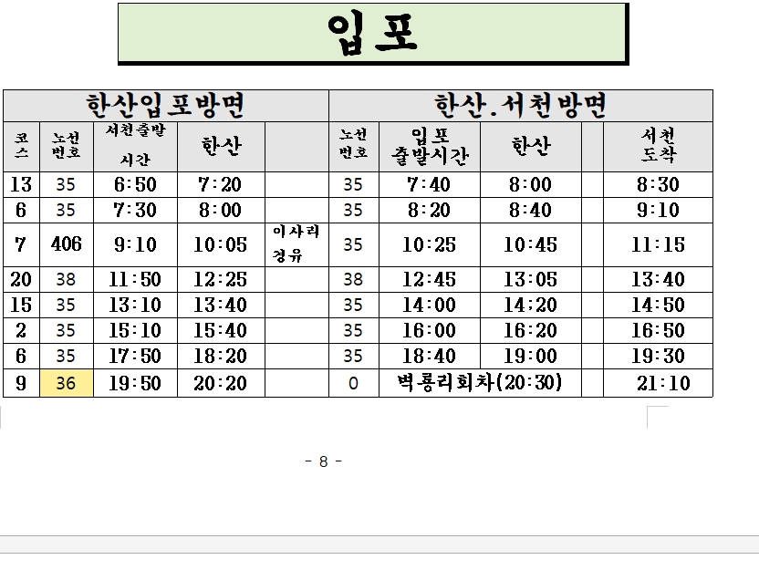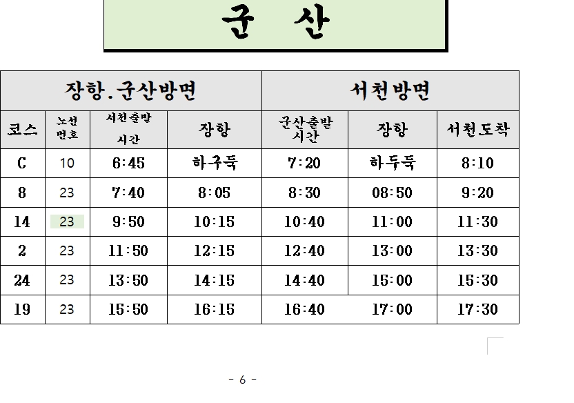 서천군 시내·농어촌버스는 첫차 오전 6시대, 막차 저녁 7~8시대 운행되며, 38개 노선에 하루 4~60분 간격으로 운행됩니다