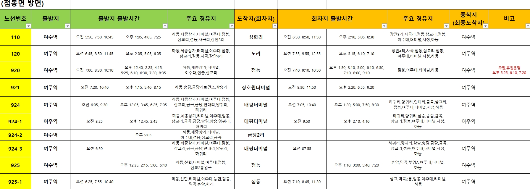 점동·금사·능서·가남 방향으로 뻗어 있으며 배차 간격이 긴 편이다. 시간표 확인이 사실상 필수다. - 광역 연계 노선