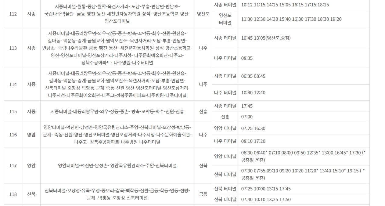 116번 버스: 영암에서 신북, 나주역을 거쳐 나주로 향하는 노선으로, 오전 7시 10분과 오후 4시 30분에 각각 출발합니다.