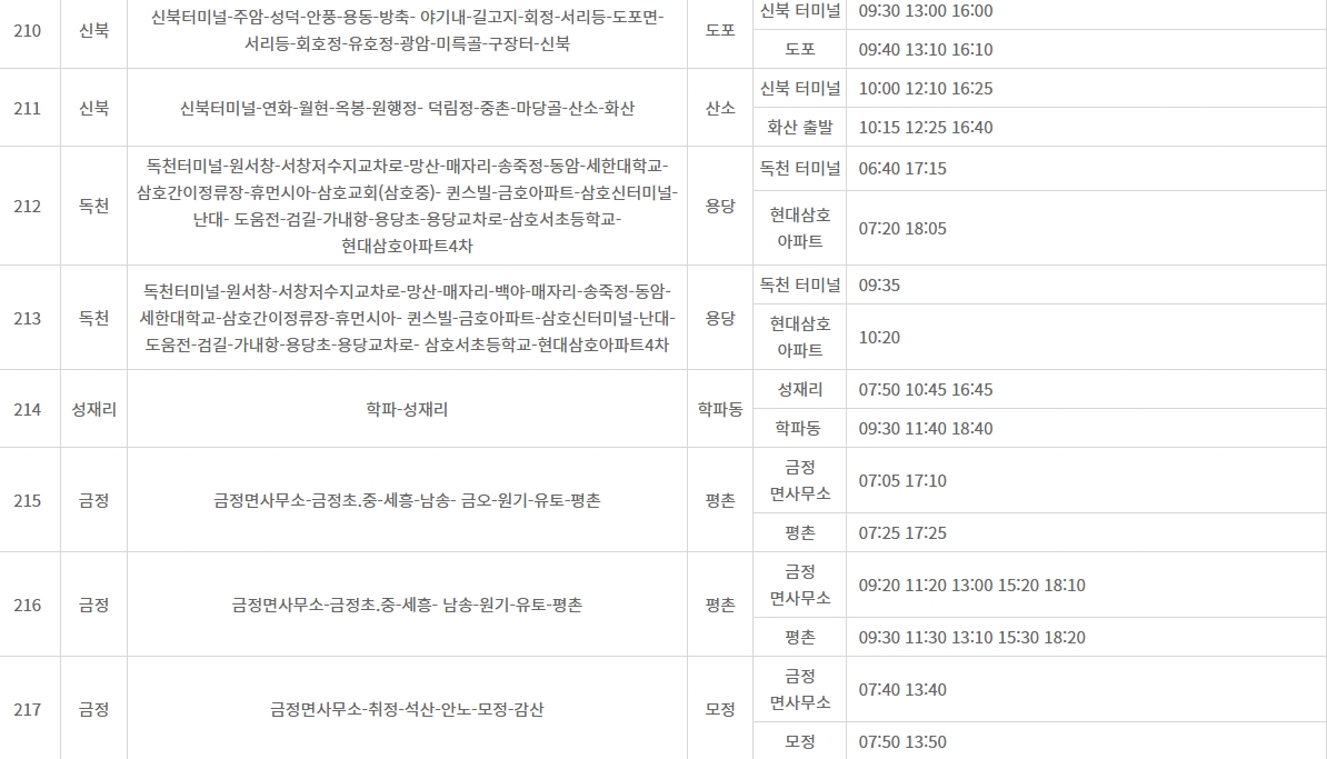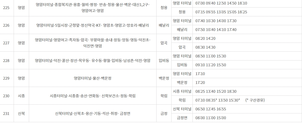 108번 버스: 영암에서 영보를 거쳐 금정으로 향하는 노선으로, 첫차는 오전 6시 20분, 막차는 오후 7시 20분에 운행되며, 총 8회 운행됩니다. ​