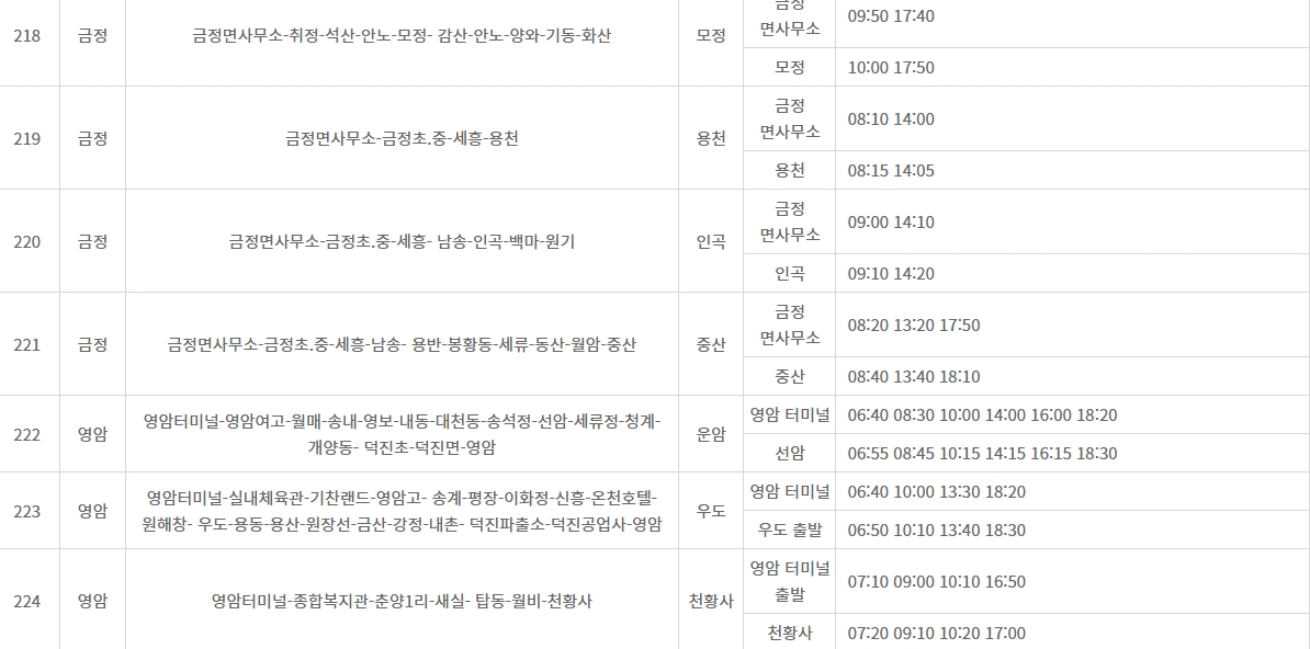 108번 버스: 영암에서 영보를 거쳐 금정으로 향하는 노선으로, 첫차는 오전 6시 20분, 막차는 오후 7시 20분에 운행되며, 총 8회 운행됩니다.