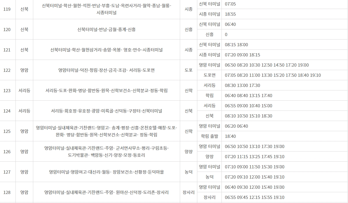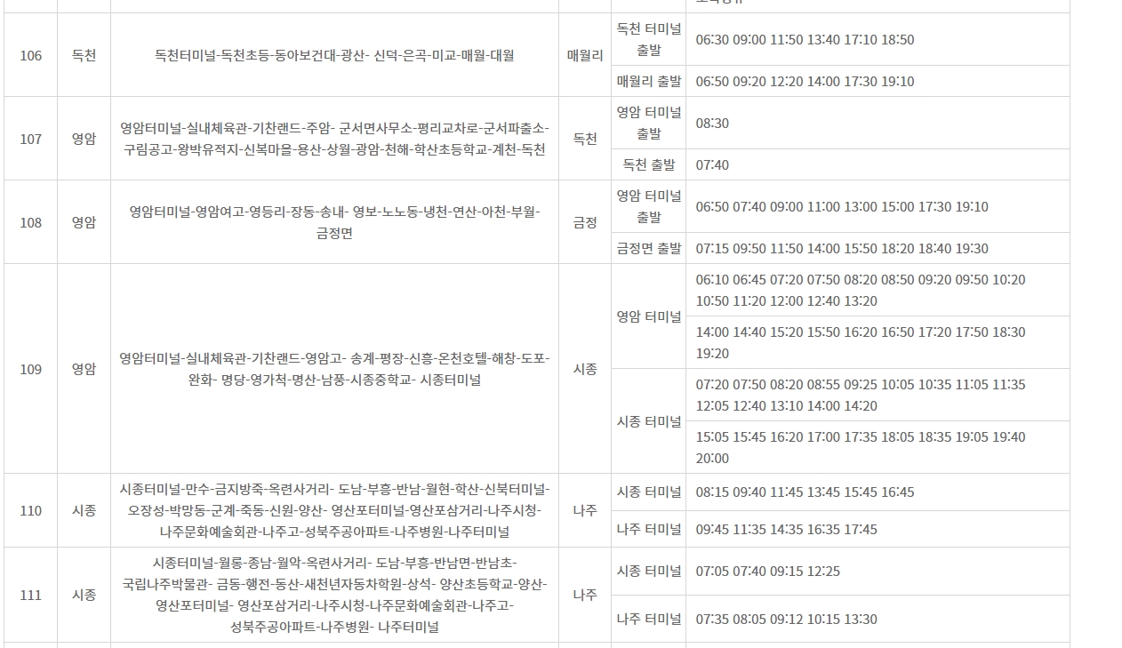 109번 버스: 영암에서 도포와 시종을 연결하는 노선으로, 첫차는 오전 6시 10분, 막차는 오후 7시 20분에 운행되며, 총 24회 운행됩니다. ​