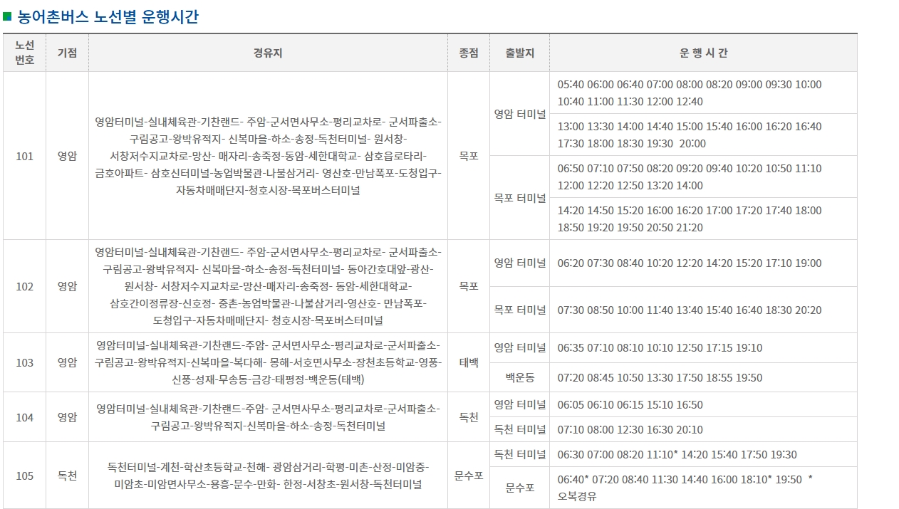 101번 버스: 영암터미널에서 출발하여 독천, 세한대학교를 경유해 목포로 향하는 노선입니다. 첫차는 오전 5시 40분, 막차는 오후 8시 30분에 운행되며, 약 28회 운행됩니다. ​