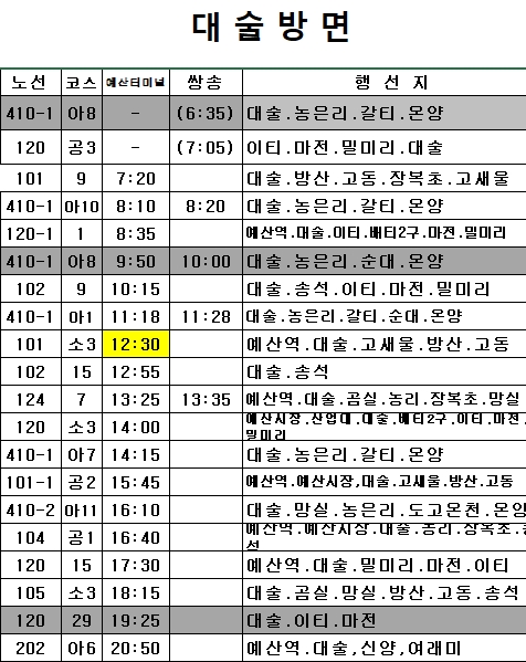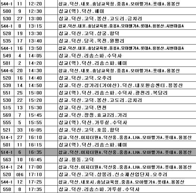 - 300~600번대(농촌 읍면) : 응봉, 광시, 삽교, 덕산, 오가 등, 하루 1~2회