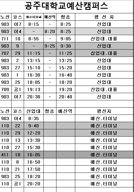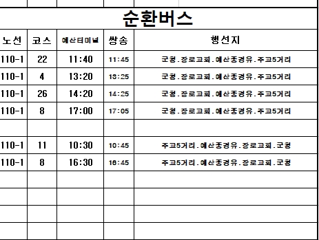 - 700~900번대 및 순환버스 : 예산여중, 공주대캠퍼스, 내포권 순환버스 1000/2000번 등, 하루 5~6회 운행