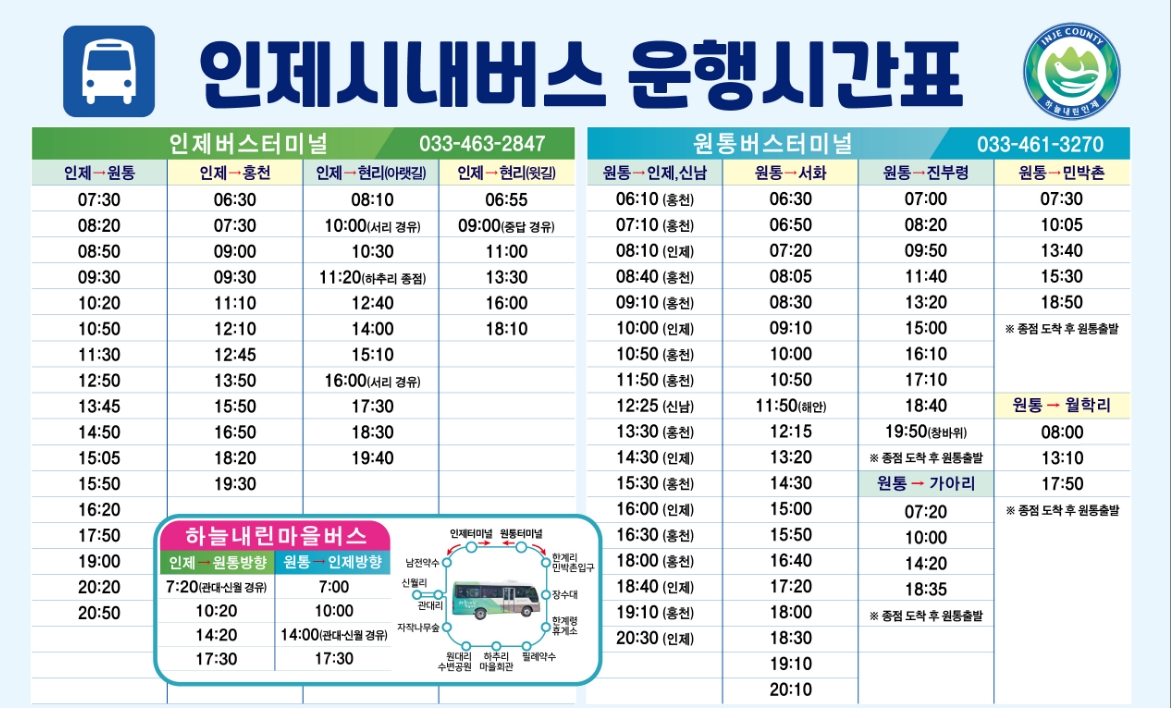 인제 시내버스 시간표는 계절이나 요일에 따라 변동될 수 있으므로, 최신 정보를 확인하기 위해 인제군 버스정보시스템을 방문하시길 권장합니다.