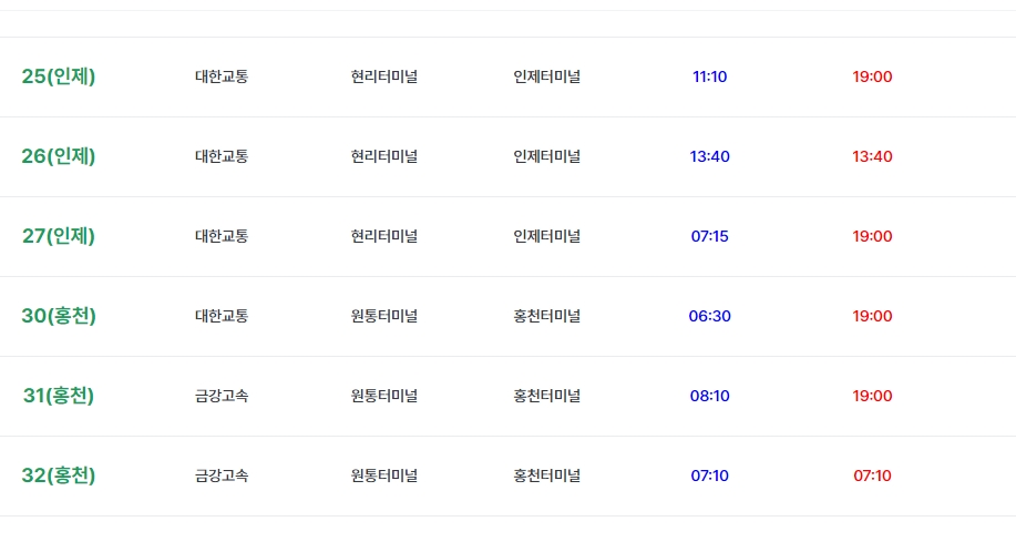 인제에서 원통으로 가는 버스는 오전 6시 10분부터 오후 2시 25분까지 다양한 시간대에 출발하며, 원통에서 인제로 돌아오는 버스는 오전 6시 10분부터 오후 3시 30분까지 운행됩니다.