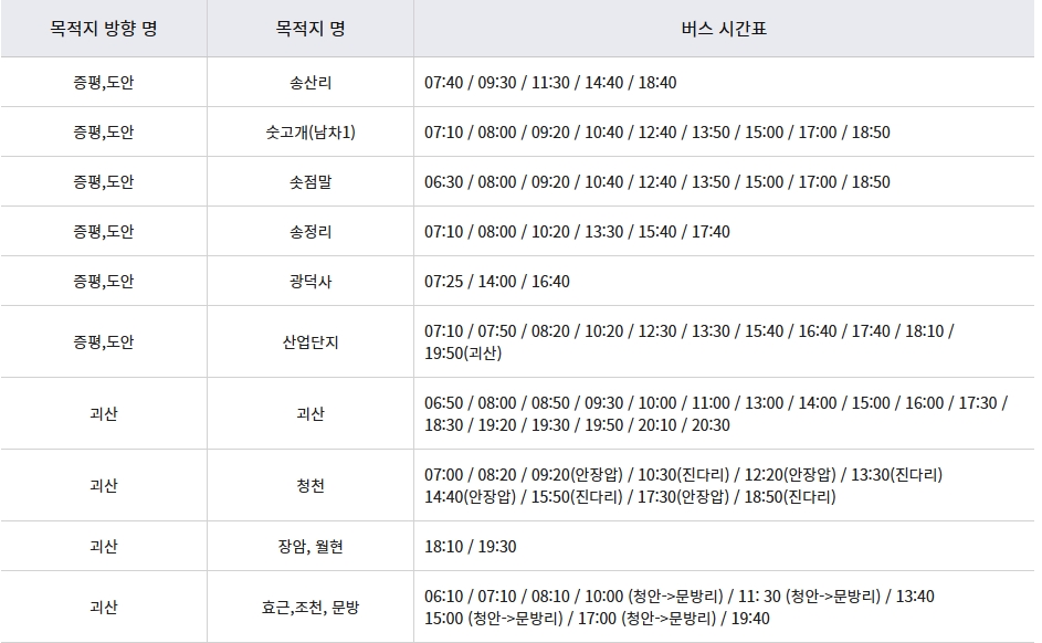 - 경유지: 증평읍 중심지를 지나 괴산시내까지 연결