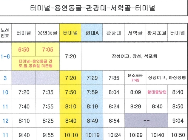 주요 관광지 접근: 태백산, 용연동굴 등 주요 관광지는 특정 노선을 통해 접근할 수 있으므로, 방문 계획 시 해당 노선의 시간표를 미리 확인하는 것이 좋습니다.