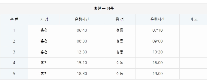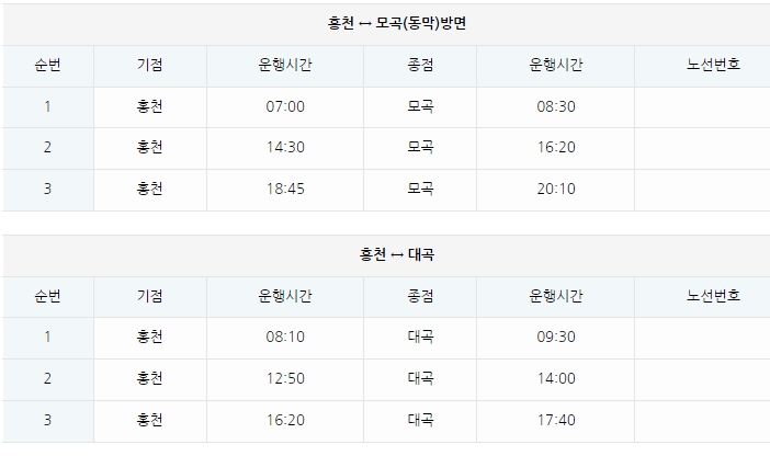 경유지: 홍천터미널, 진리, 학다리, 신아2차아파트, 화동리, 송학마을 운행 시간: