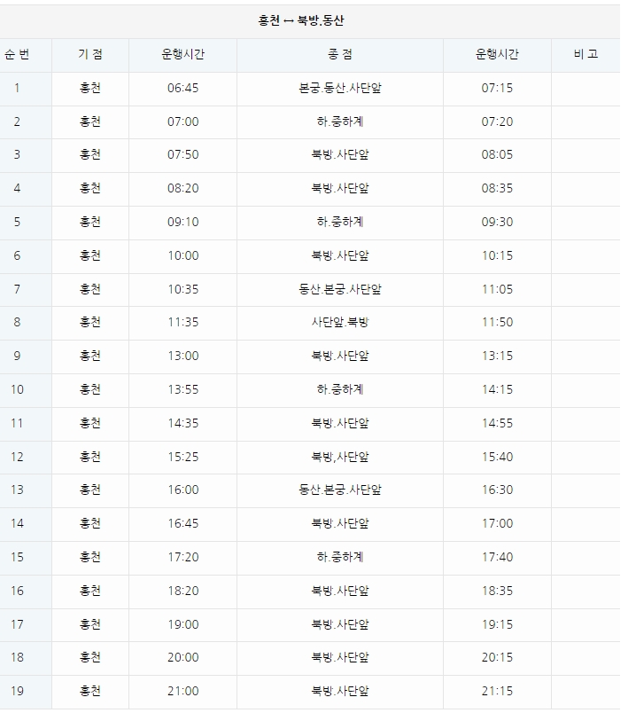 경유지: 홍천, 군청입구, 화동입구, 상화계삼거리, 화계초교, 능평휴게소, 부사원, 동산, 역전평사거리, 본궁 운행 시간: