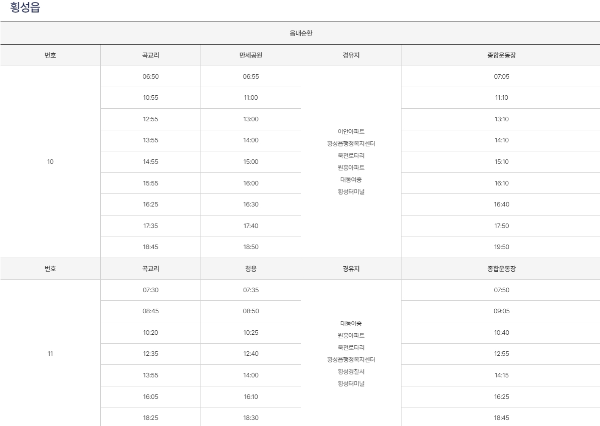 더 자세한 횡성 시내버스 시간표 및 노선 정보는 횡성군 대중교통정보 웹사이트에서 확인하실 수 있습니다.